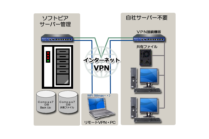 | 本支店間のVPN接続で広域管理 | インターネットができる環境があれば場所を問わないため、専用接続不要。 | |
